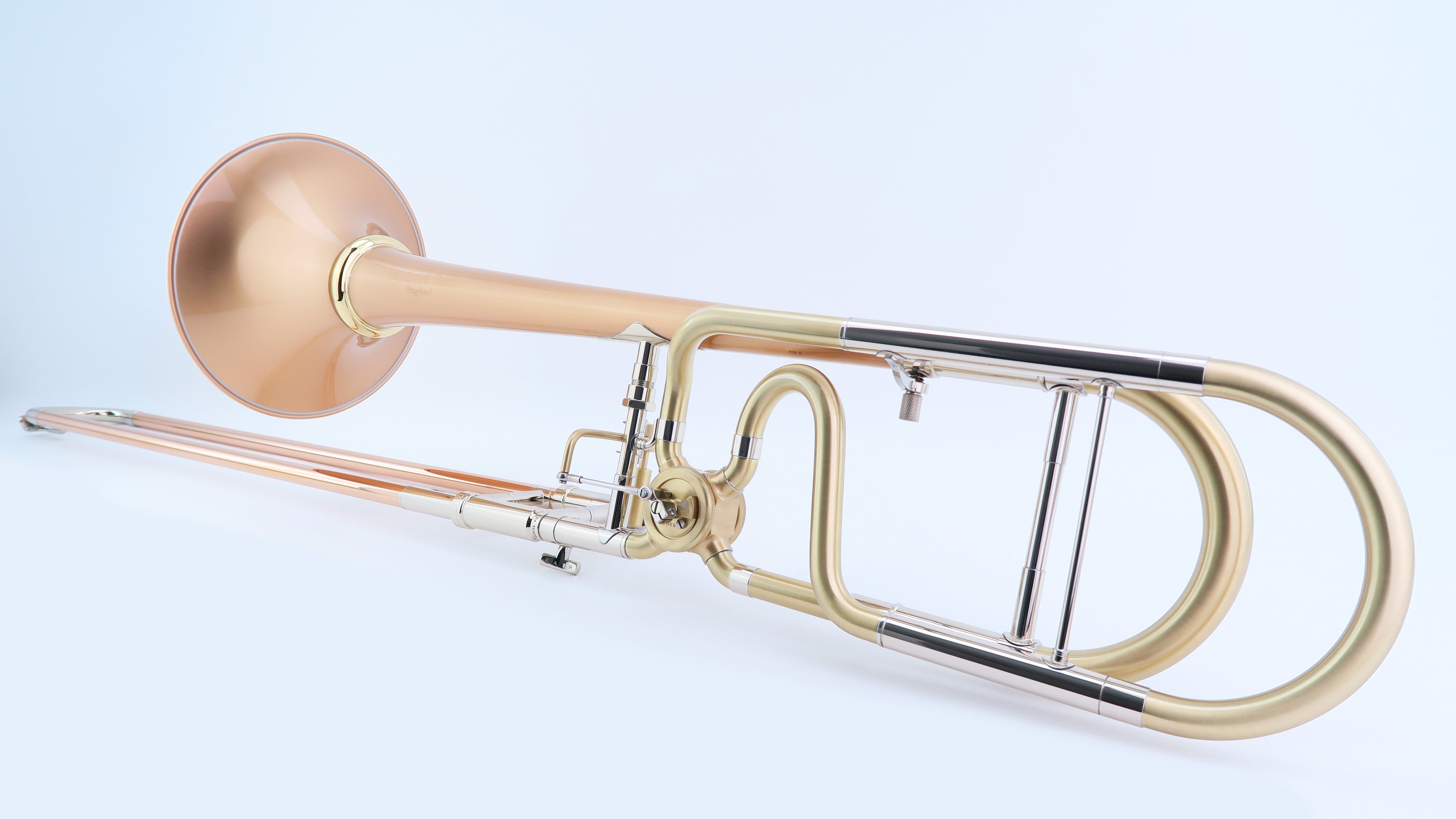This instrument has been developed with single-radius bows on the hand slide, F tuning slide, and main tuning slide. Single-radius bows allow for a more consistent transition across the dynamic range, providing greater control for the player and delivering a more open feel and sound.